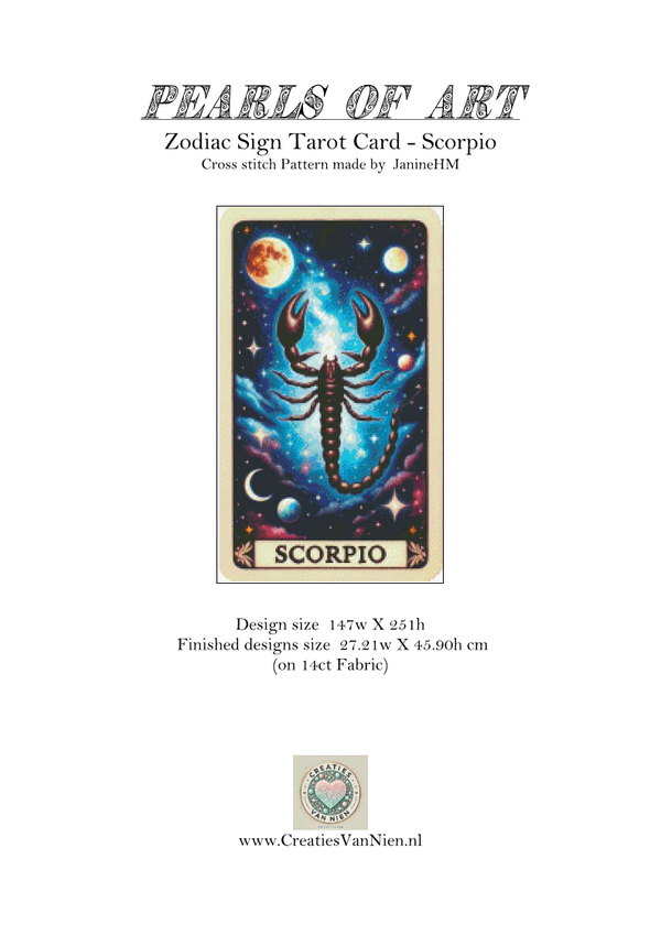 Duik in de intense en mysterieuze wereld van het sterrenbeeld Schorpioen met het Scorpio Zodiac Tarot kruissteekpatroon. Dit ontwerp in tarotkaartstijl combineert diepe symboliek met verfijnde details, perfect voor liefhebbers van astrologie en mystieke kunst. Een krachtig en intrigerend project voor de gepassioneerde borduurder! β¨β
